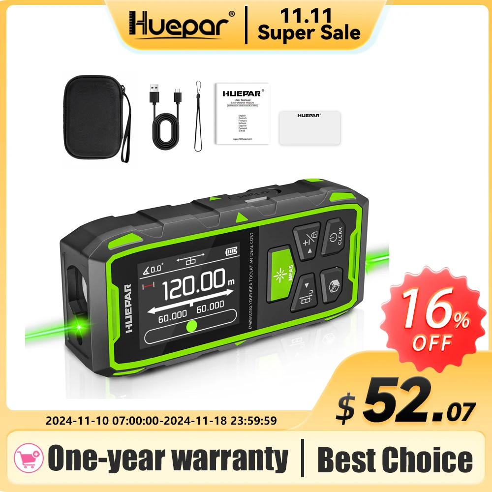 Huepar 듀얼 레이저 거리 측정기 그린 빔 레이저 계량기, 백라이트 LCD 디스플레이 및 USB 포함, 다중 단위 측정 도구, 120m, 200m